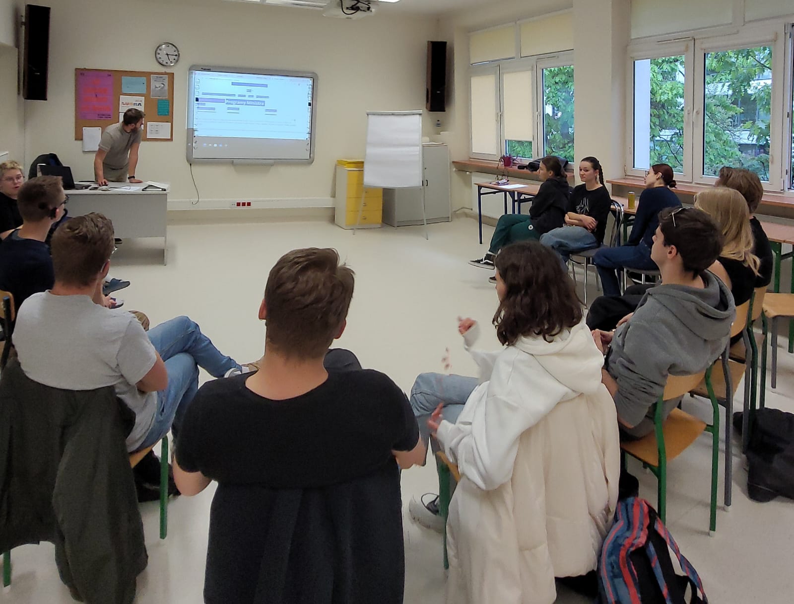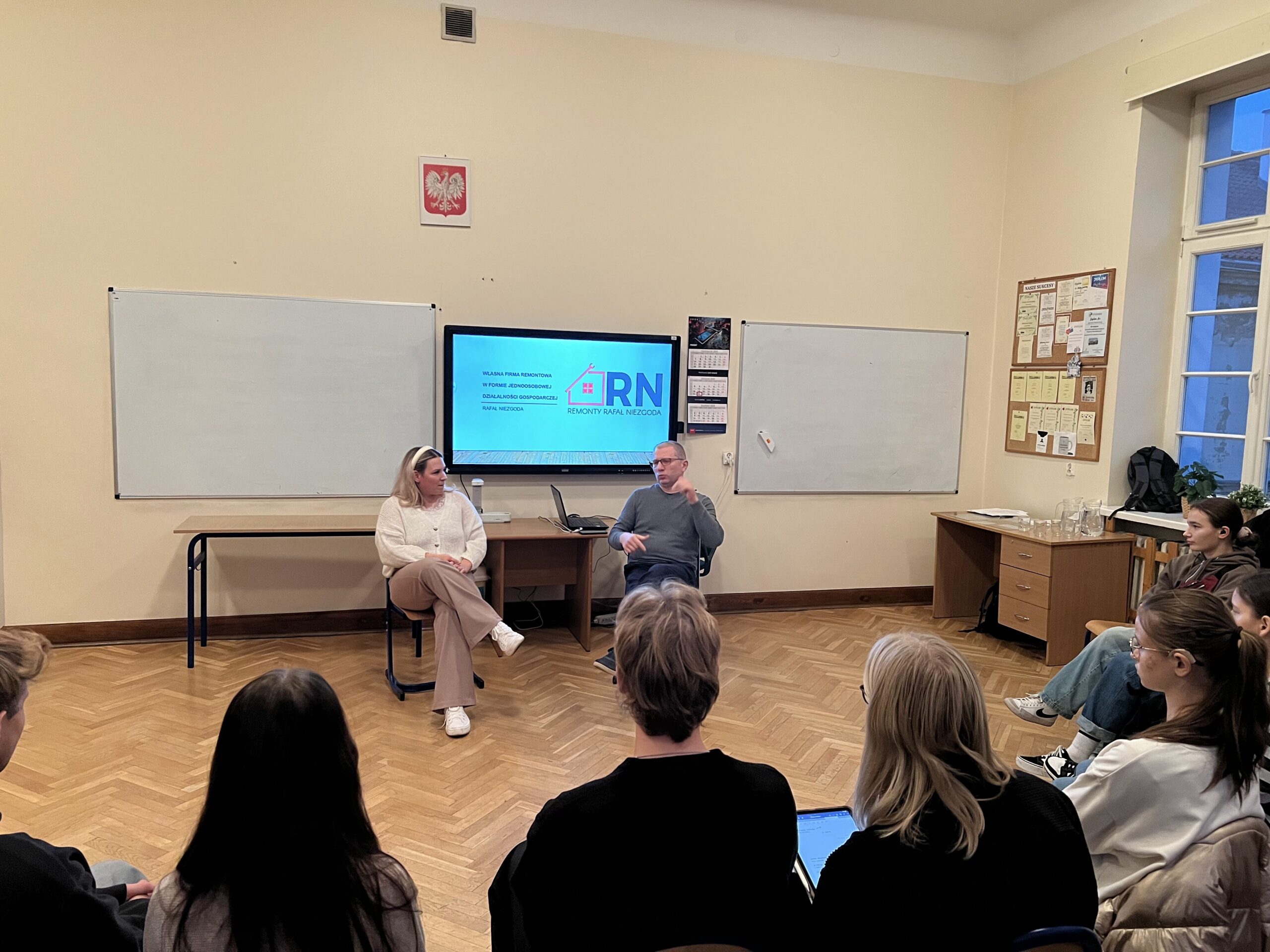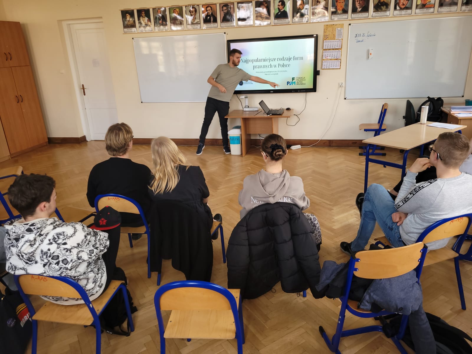 Pan Marcin wygłosił prelekcję na temat pięciu najczęściej wykorzystywanych form prawnych działalności: jednoosobowej działalności gospodarczej, fundacji, stowarzyszenia, spółki z o.o. oraz spółki akcyjnej. Omówił ich zalety, wady, potencjalne zagrożenia oraz opłacalność zakładania poszczególnych form w zależności od sytuacji. Na zakończenie uczniowie wzięli udział w teście składającym się z kilkunastu pytań i poradzili sobie zaskakująco dobrze, co pokazuje, że uważnie śledzili przebieg prelekcji i starali się wynieść z niej jak najwięcej.