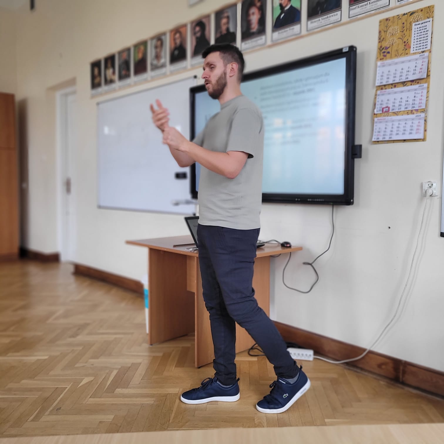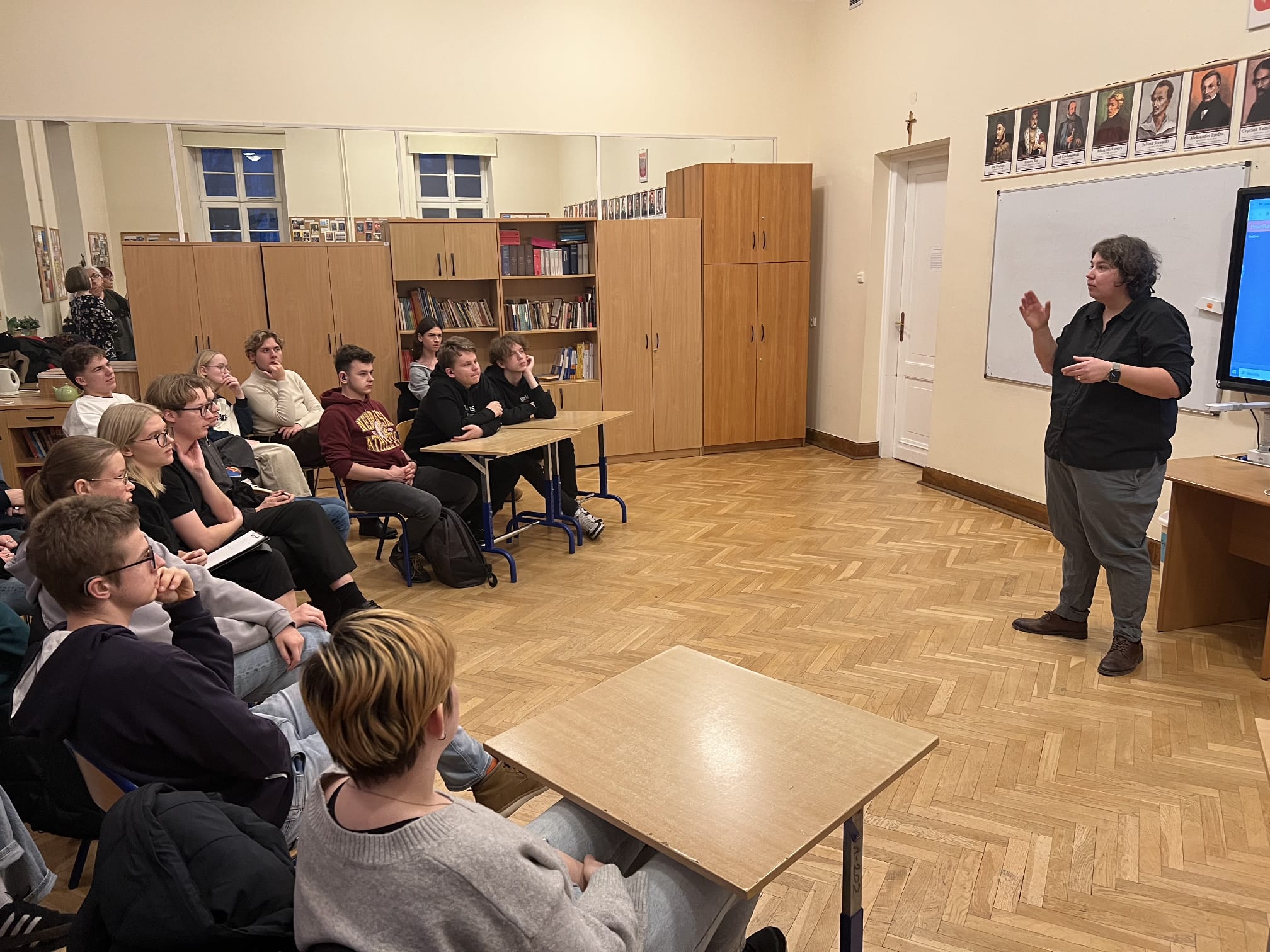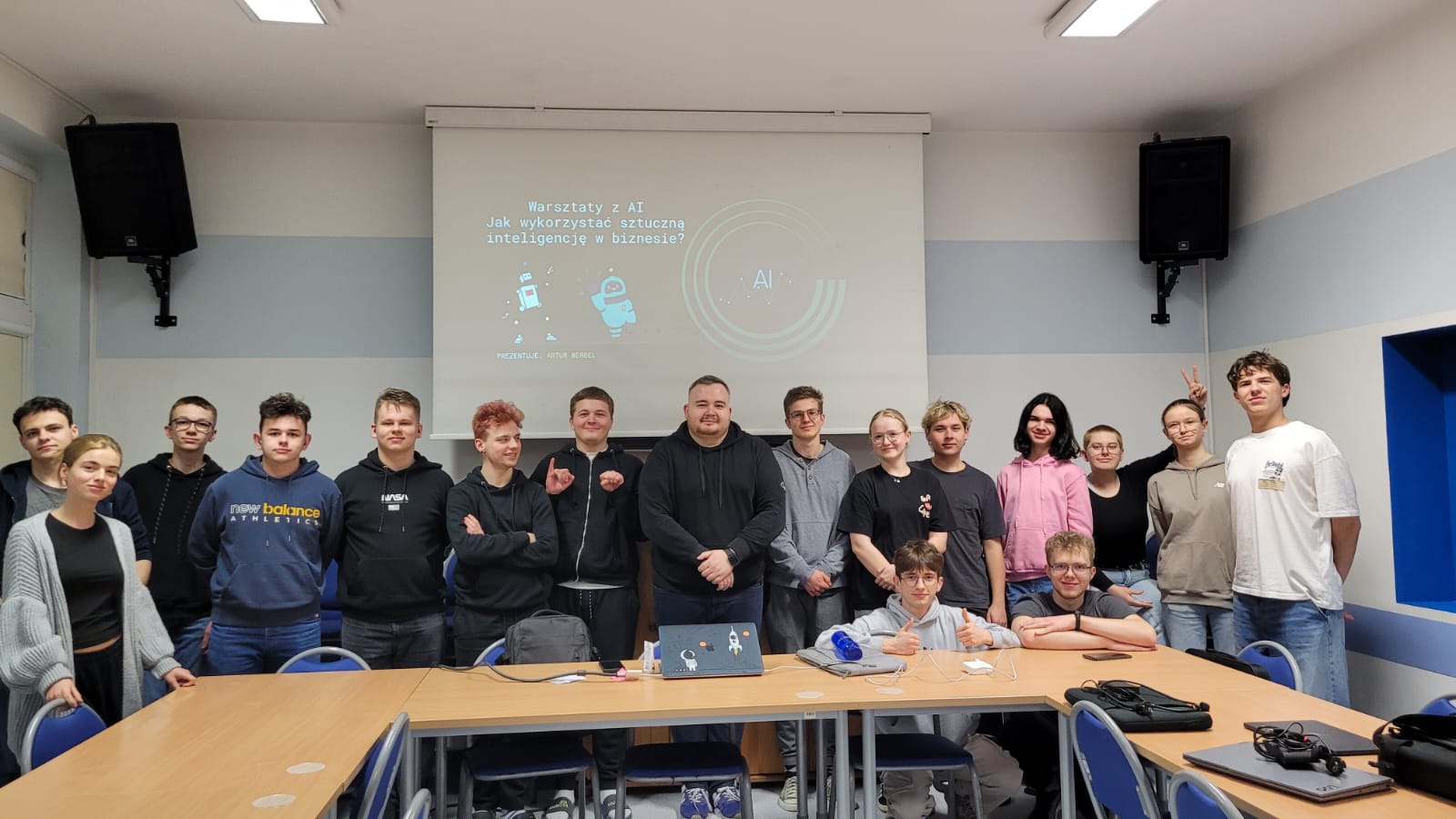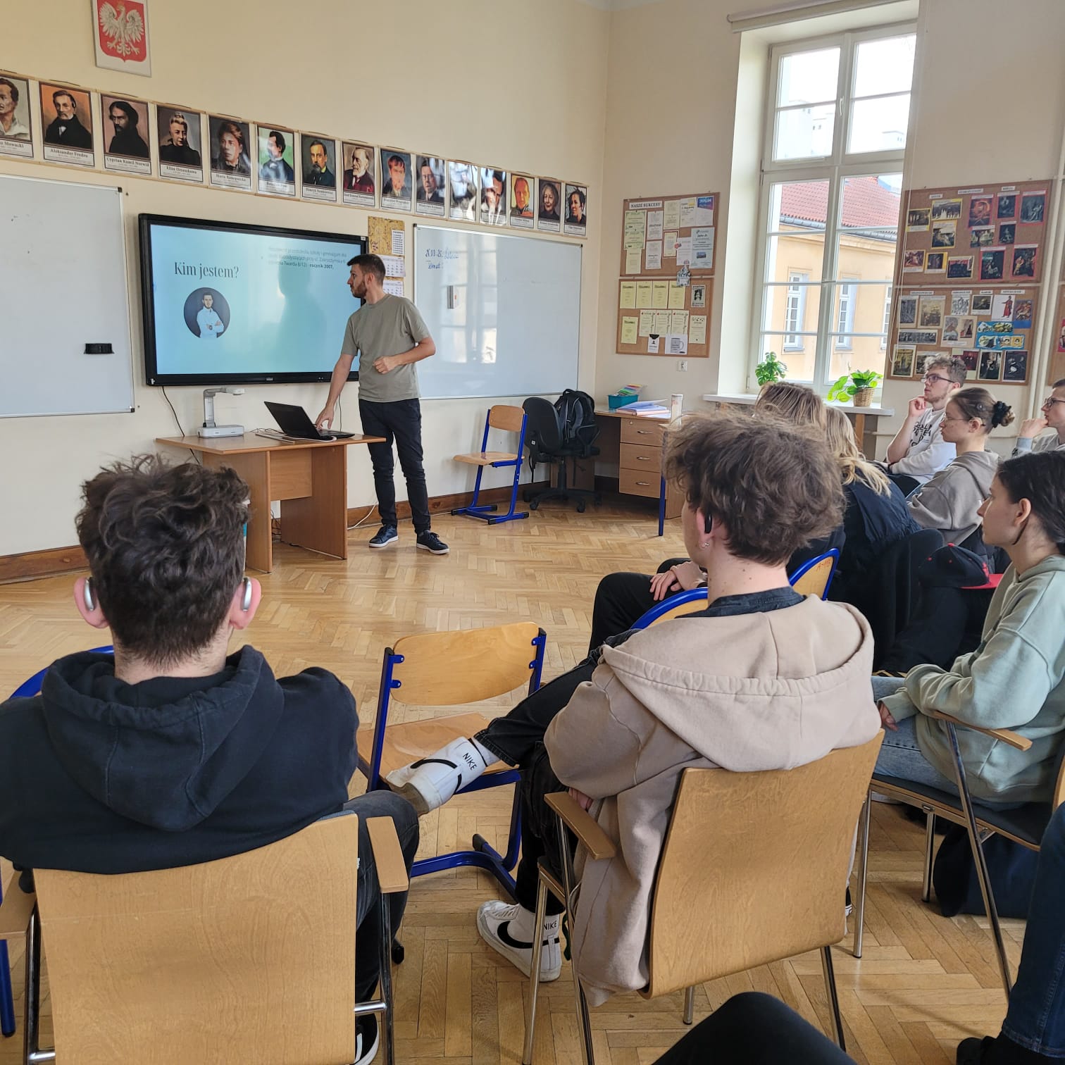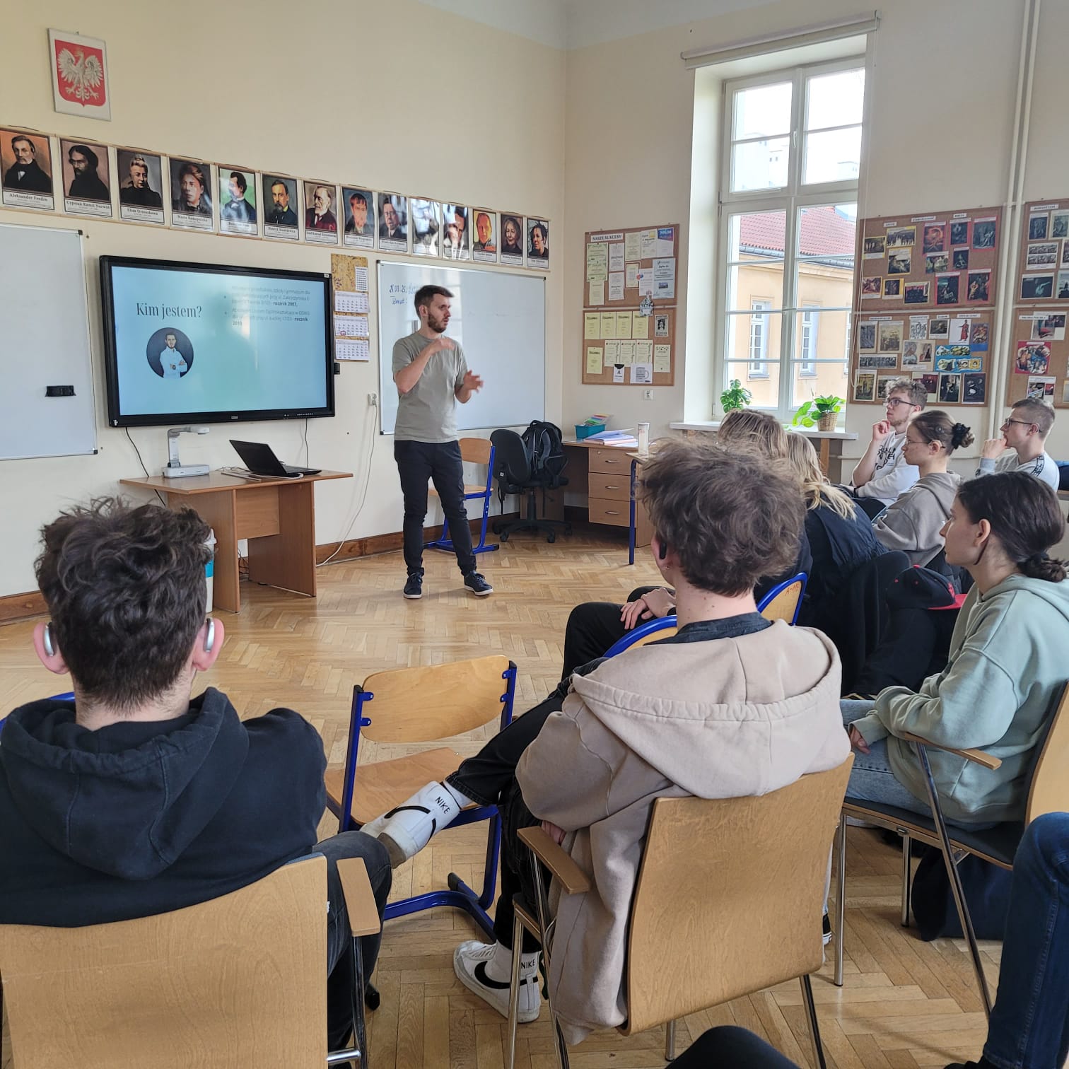 Podczas prelekcji o AI w biznesie uczestnicy przekonali się, że sztuczna inteligencja nie jest zagrożeniem, lecz narzędziem wspierającym rozwój firm. Wystąpienie było niczym zastrzyk technologicznej energii! Pan Artur obalił mity na temat AI i zaprezentował jej praktyczne zastosowania w marketingu, analizie danych, rozliczeniach finansowych czy obsłudze klienta. Prelegent podkreślił też znaczenie odpowiedzialnego i etycznego korzystania z nowych technologii. Uczniowie aktywnie włączali się w dyskusję, zadawali pytania i dzielili się własnymi spostrzeżeniami. Było sporo śmiechu, interakcji i momentów “Wow, to naprawdę działa!”. Wydarzenie zakończyło się optymistycznym przesłaniem „AI to przyszłość, z której warto mądrze korzystać już dziś”.